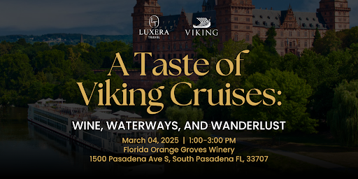 Join us on March 4, 2025 from 1:00pm to 3:00pm at the Florida Orange Groves Winery, located at 1500 Pasadena Ave S, South Pasadena, FL 33707, and discover how Luxera Travel and Viking can make your travel dreams come true!